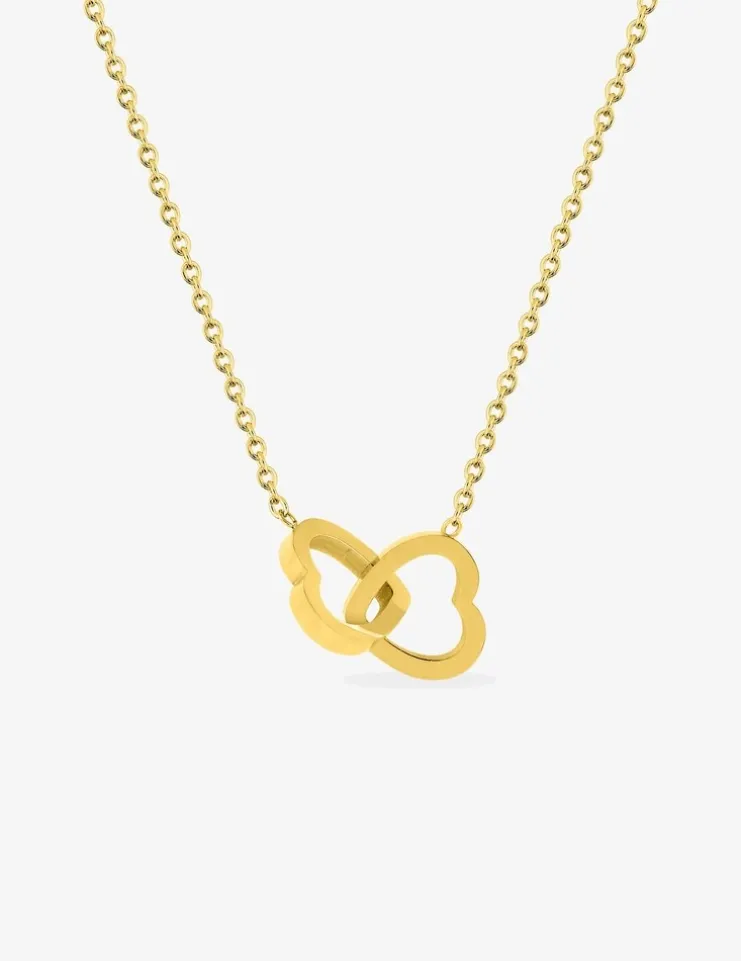 Enfilez une touche d’amour autour de votre cou avec ce collier en acier doré. Son pendentif se compose de deux cœurs qui s’entremêlent, et il mesure 38 cm plus 5 cm de chaîne de rappel.