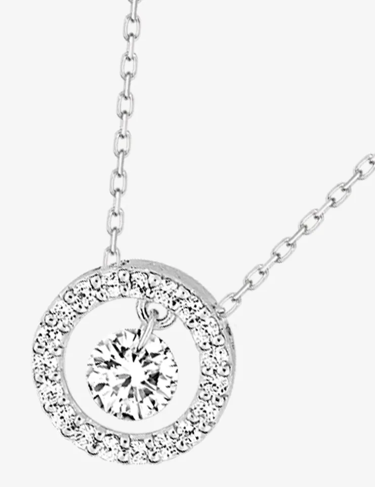 Collier cercle en or blanc 375 ‰ (9 carats) pavé d’oxydes de zirconium avec,en son centre, un oxyde suspendu à un petit anneau. Ce cercle est attaché à une chaîne forçat d’une longueur de 42 cm, fermée par un anneau ressort.Le poids moyen de ce bijou est de 1.20 gr.Tout en finesse, ce somptueux collier scintillera à votre cou !