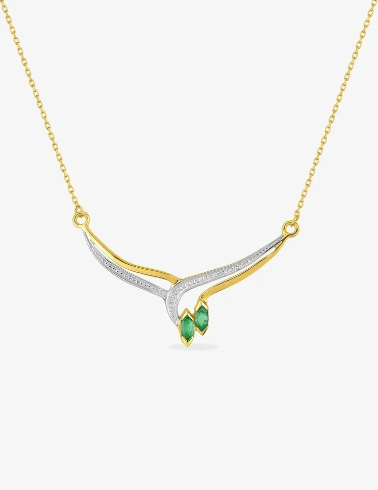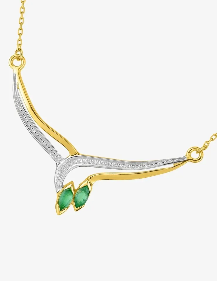Ce collier possède un brin en or jaune 375‰ (9 carats) ainsi qu’un brin de rhodium à l’effet empierré sublimés par deux émeraudes taillées en navette. Il a un poids d’or de 1,55 g pour 42 cm avec anneau intermédiaire à 40 cm. Un modèle sophistiqué et élégant.