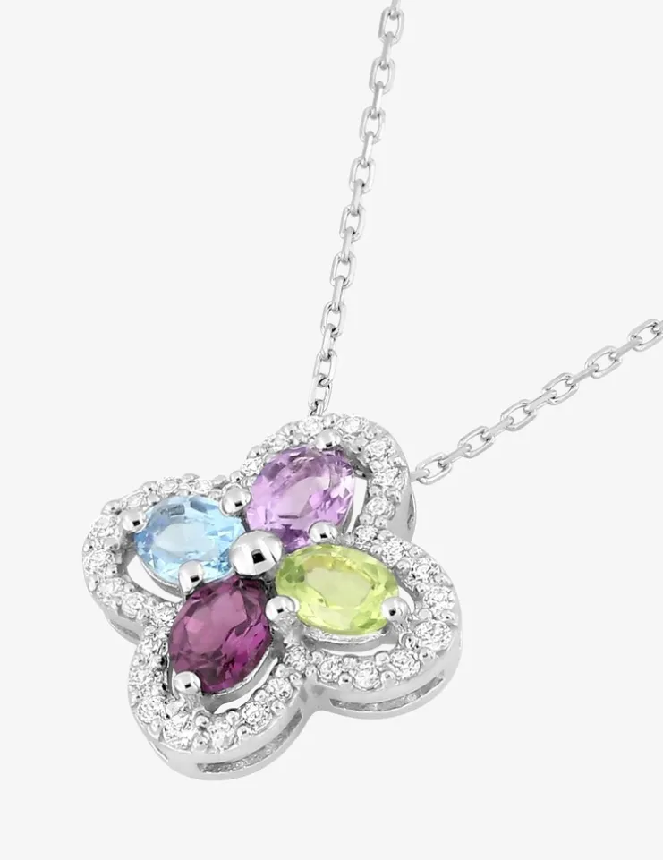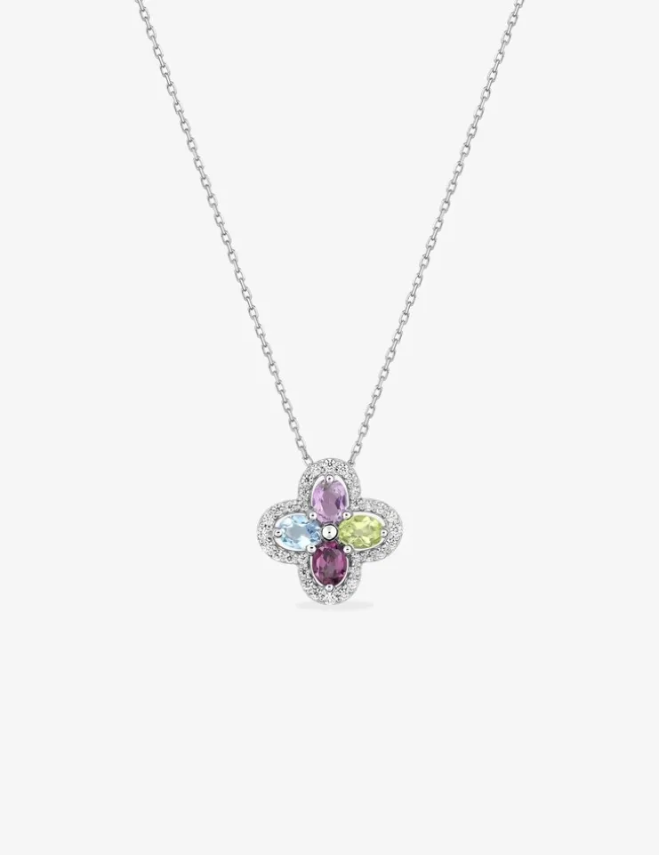 Collier en or blanc 375 ‰ (9 carats). Chaîne forçat 42 cm avec anneau intermédiaire à 40 cm et fermoir anneau ressort, le motif pendant se compose d’un contour serti d’oxydes de zirconium, accompagné de 4 pierres fines serties griffes, avec deux améthystes, une topaze bleue traitée et un péridot. Le poids d’or théorique est de 1,60 g.