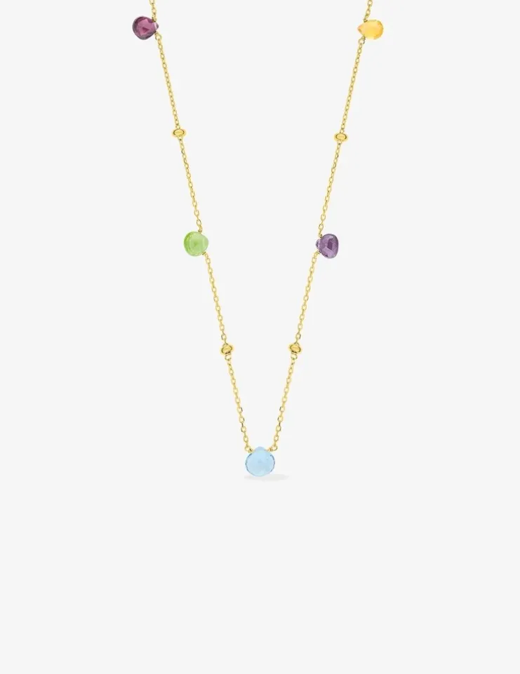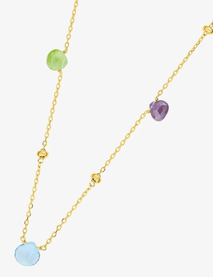 Ce Collier or jaune 375‰ (9 carats) est composé d’une chaine maille forçat ponctuée d’un péridot, d’un grenat, d’une topaze bleue traitée et d’une citrine. Les pierres fines sont en forme de goutte et sont agrémentées de petites perles en or.Ce bijou au poids d’or moyen de 1,20 g a une longueur de 42 cm avec un anneau intermédiaire à 40 cm et équipé d’un fermoir à anneau ressort. Ce charmant collier orné de pierres fines vous fera rayonner et apportera une note de couleur à vos tenues.