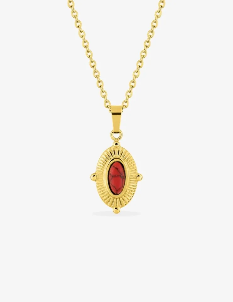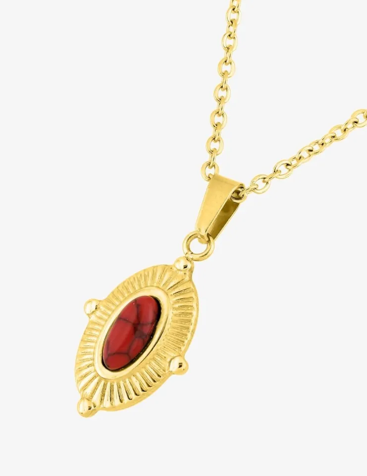 Collier pendentif acier doré, motif ovale et turquoise rouge synthétique SO OR