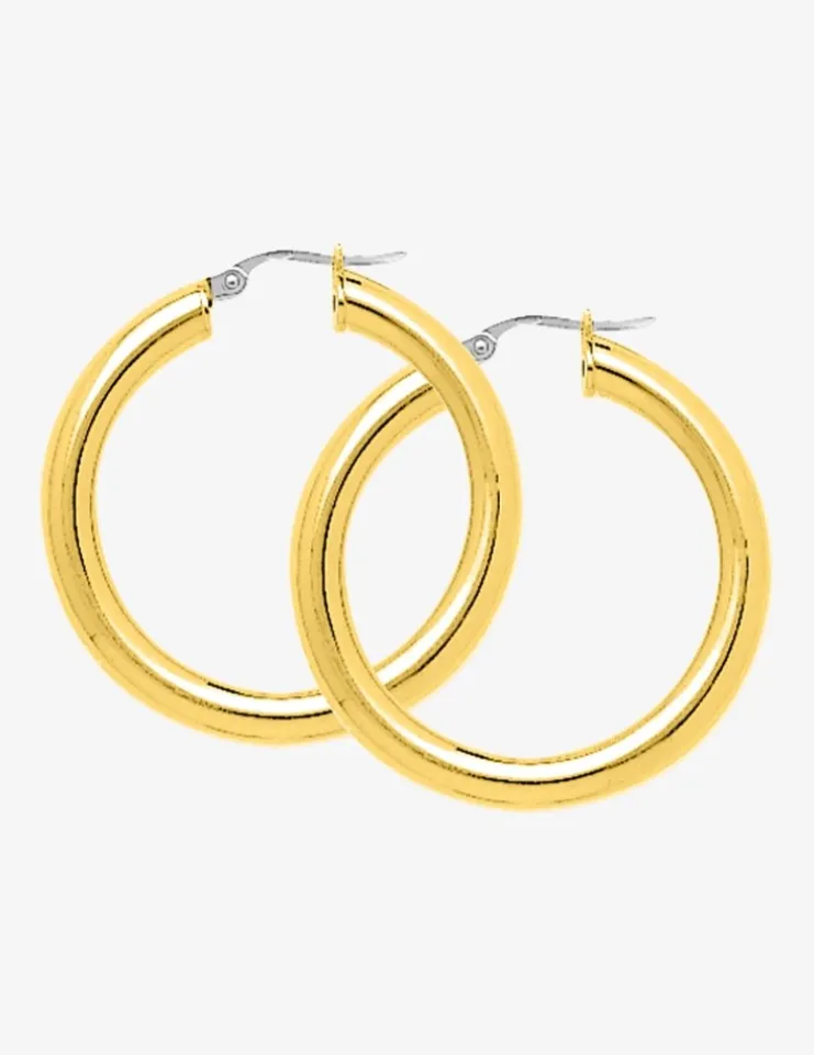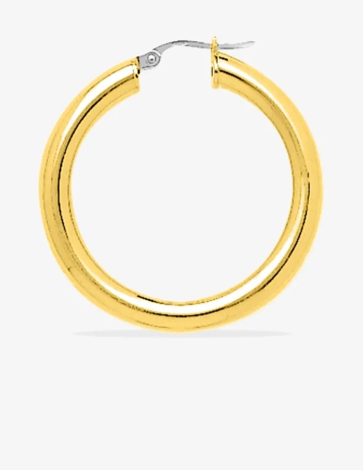 Craquez pour ces indispensables créoles en or jaune 750‰ (18 carats). Elles mesurent 25 mm de diamètre pour un poids d’or de 3,70 g, et se composent d’un fil de 4 mm avec fermoir cliquet.