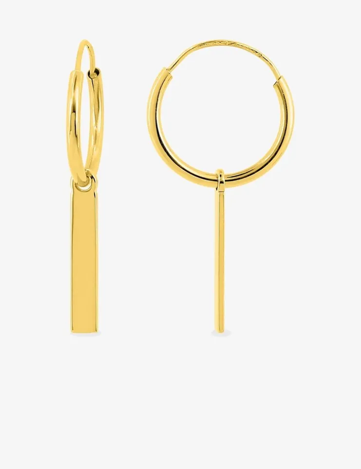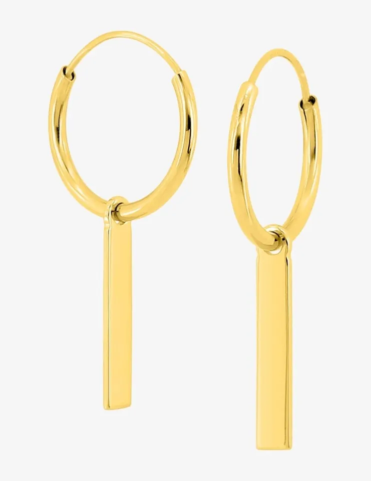 Créoles en or jaune 375 ‰ (9 carats), d’un diamètre extérieur de 10 mm, ornées d’une breloque rectangulaire de 10 mm de hauteur. Mesurant 20 mm de hauteur totale, ces boucles d’oreilles affichent un poids d’or moyen de 0,40 g. Avec des finitions fines et élégantes, elles se ferment en toute sécurité grâce à un fermoir à anneau.