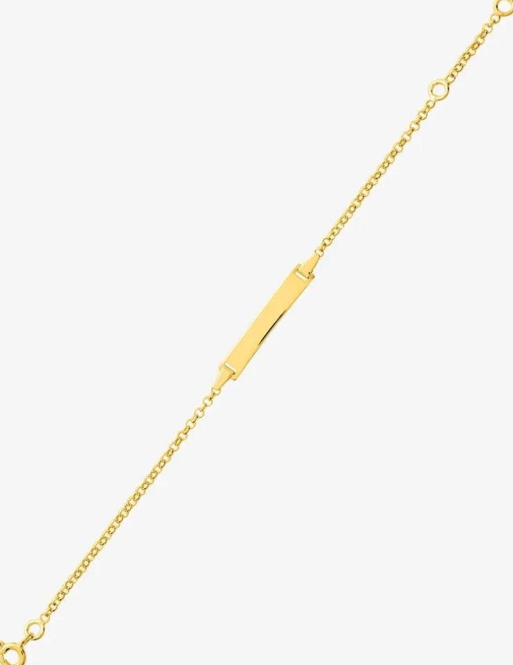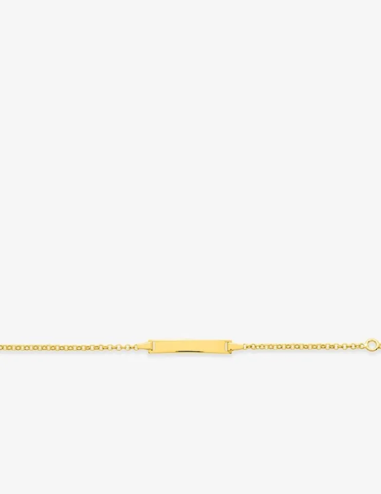 Cette gourmette pour bébé en or jaune 375‰ (9 carats) possède une chaîne forçat de 14 cm avec un anneau intermédiaire à 12 cm et une plaque rectangle de 22 mm de longueur personnalisable. Le fermoir est un anneau ressort et le poids d’or est de 1,60 g. Le cadeau idéal pour une naissance, un anniversaire ou un baptême.