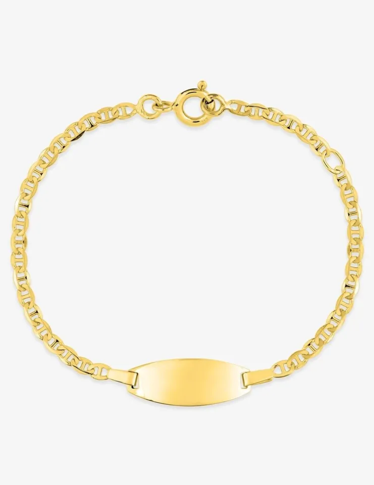Gourmette pour bébé en or jaune 375 ‰ (9 carats), ornée d’une élégante maille marine et d’une plaque en forme de tonneau, gravable pour un bijou unique et personnalisable. Mesurant 14 cm avec un anneau intermédiaire à 12 cm, ce bijou léger pèse en moyenne 1,80 g. Un cadeau idéal pour célébrer une naissance de manière mémorable.