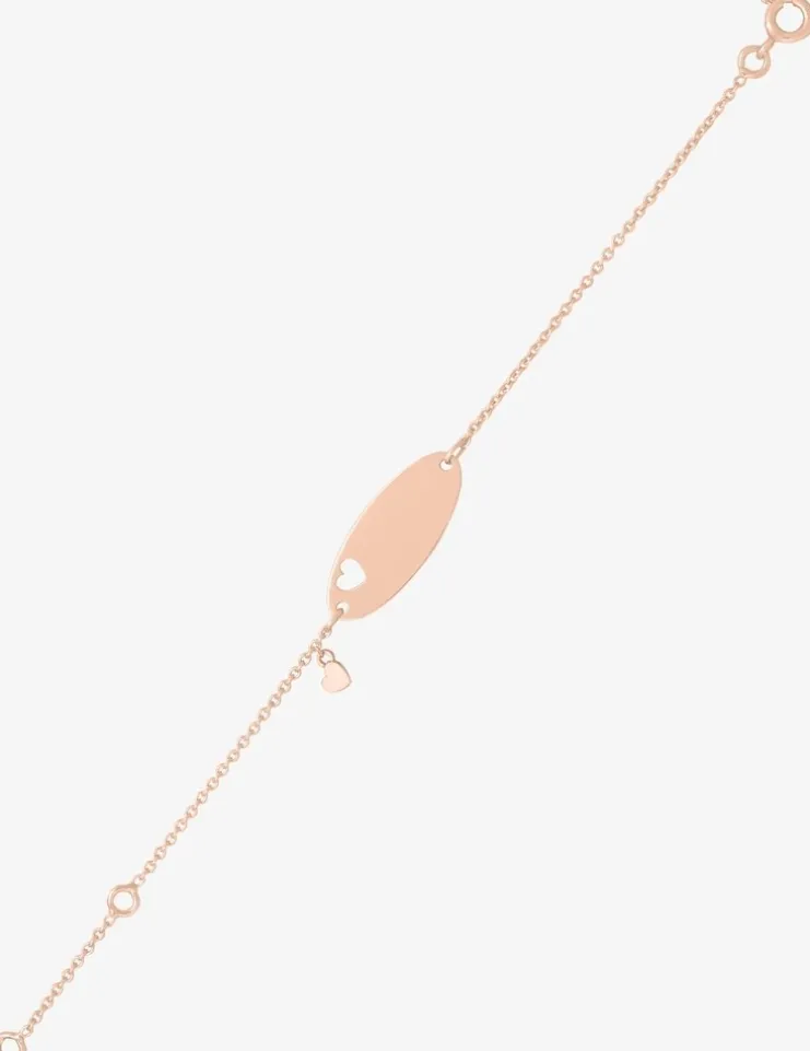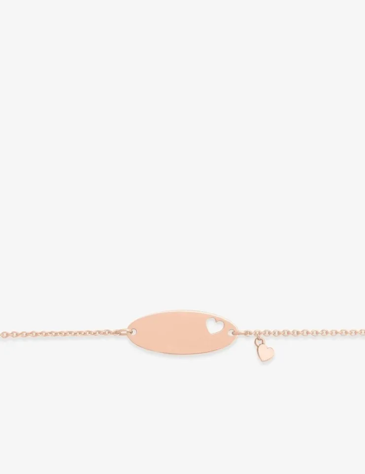 Gourmette bébé en or rose 750 ‰ (18 carats). Elle se compose d’une chaîne forçat, d’une plaque ovale avec une fine découpe au motif de cœur et d’une petite pampille cœur. Le fermoir est un anneau ressort, la chaîne mesure 14 cm avec un anneau intermédiaire à 12 cm et le poids d’or moyen est de 1,70 g. Faites graver votre gourmette pour en faire un bijou unique.