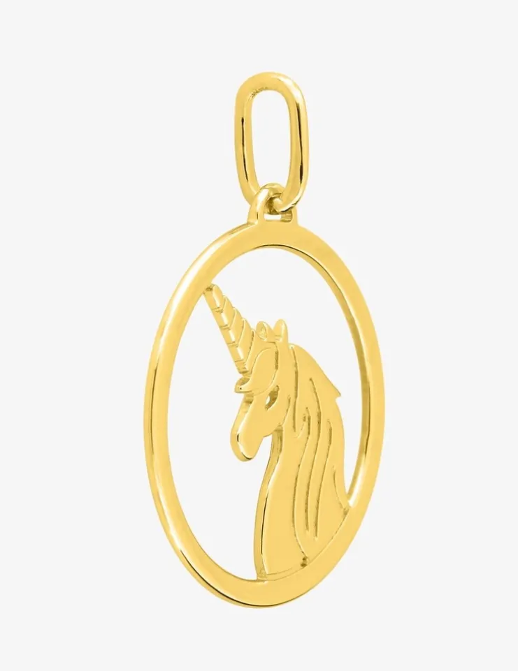 Une jolie tête de licorne à l’intérieur de ce pendentif rond ajouré en plaqué or. Il est monté sur une bélière et mesure 14 mm de diamètre extérieur. La licorne comme compagnon de vie imaginaire, reconnue pour ses pouvoirs et sa pureté.