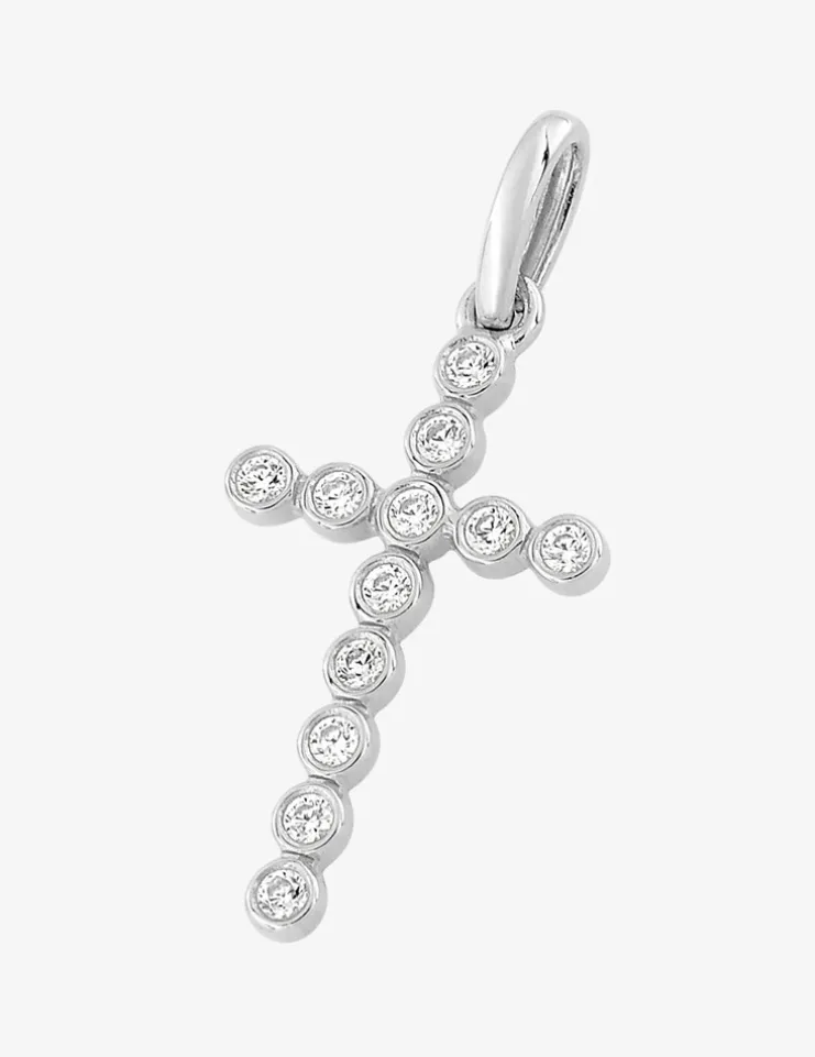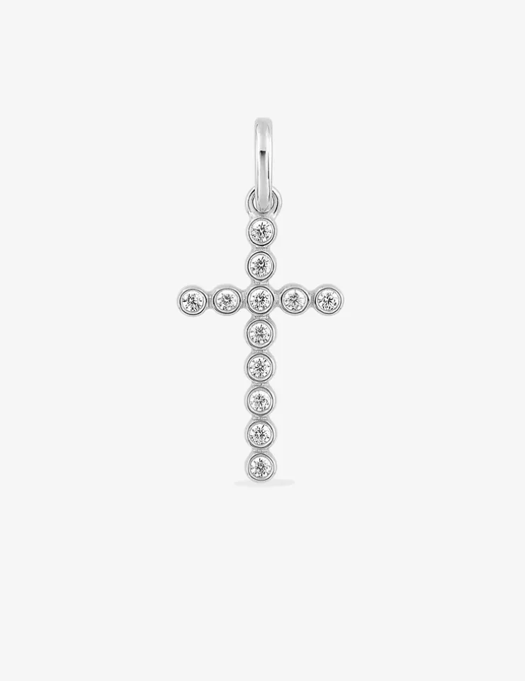 Pendentif en or blanc 750 ‰ (18 carats). Pendentif croix ornée d’oxyde de zirconium, le poids d’or théorique est de 0,65 g et mesure 20 mm de haut.