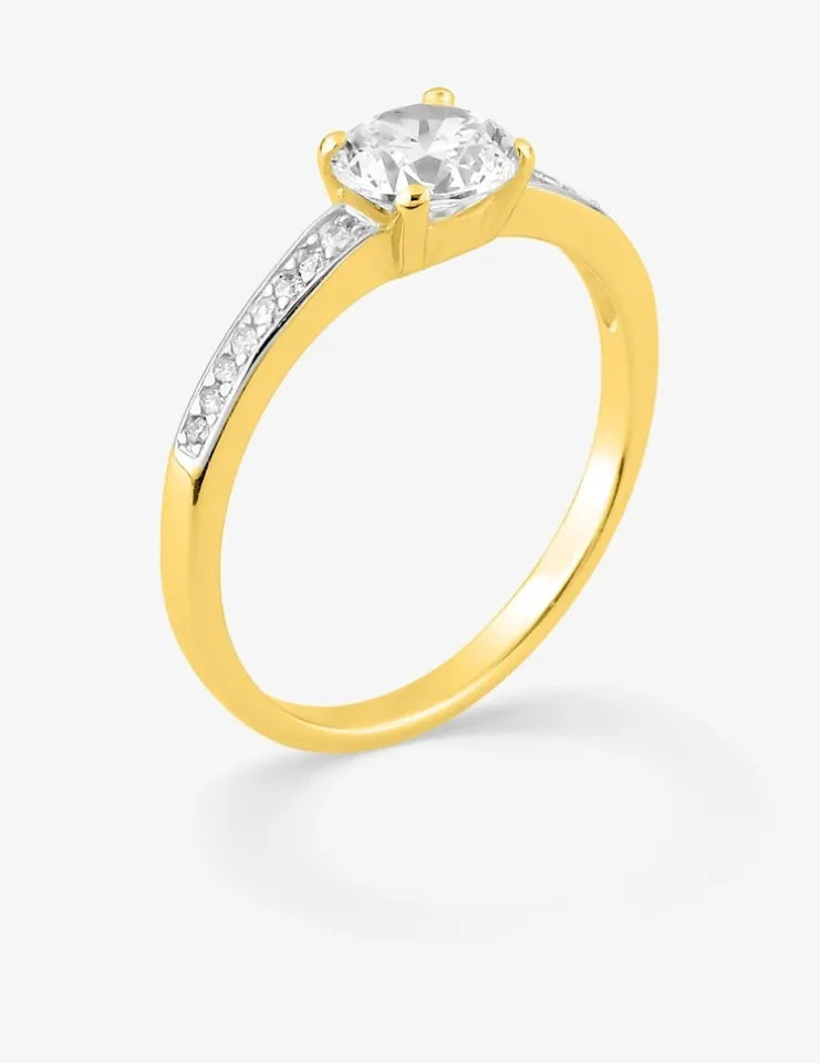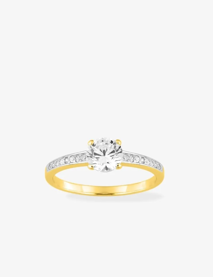 Ce solitaire en plaqué or arbore un oxyde de zirconium de 6 mm de diamètre serti griffes accompagné d’oxydes de zirconium sur du rhodium. Cette bague est un bijou éclatant qui sublimera vos mains.