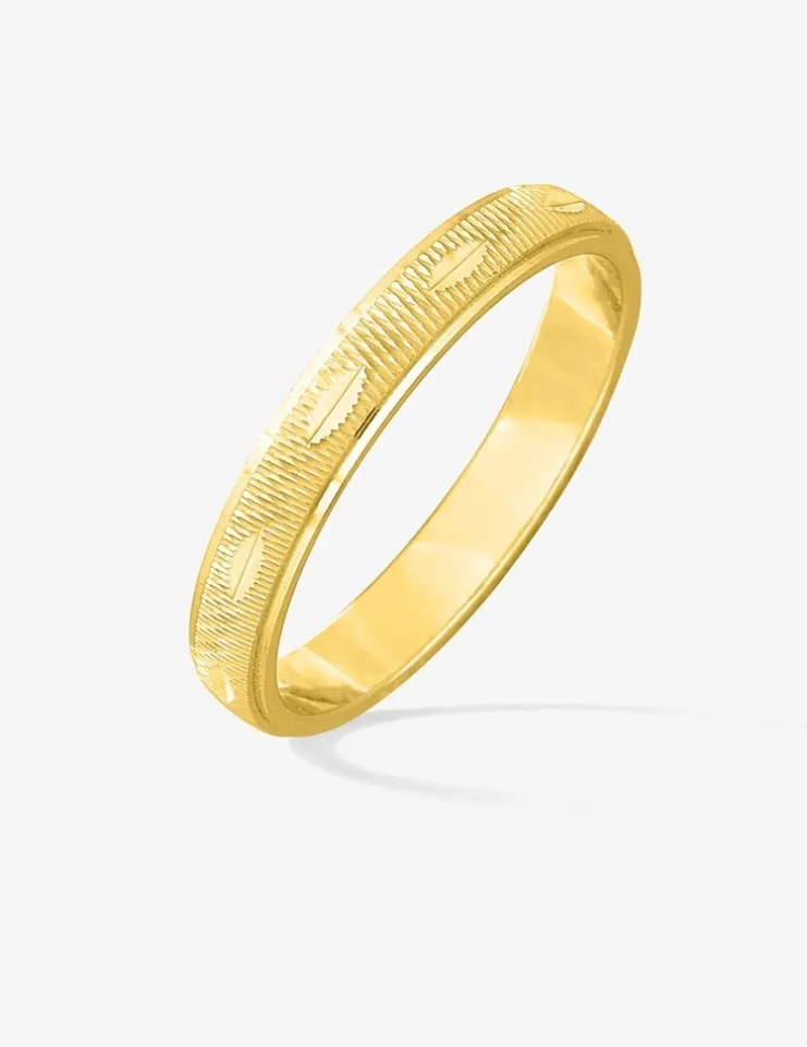 Cette alliance en or jaune 750‰ (18 carats) possède une finition texturée et de légères entailles qui lui donnent une touche d’originalité. Elle mesure 3 mm de largeur et pèse 2,55 g en taille 54. L’intérieur du corps de bague peut être gravé pour en faire un bijou à votre image.