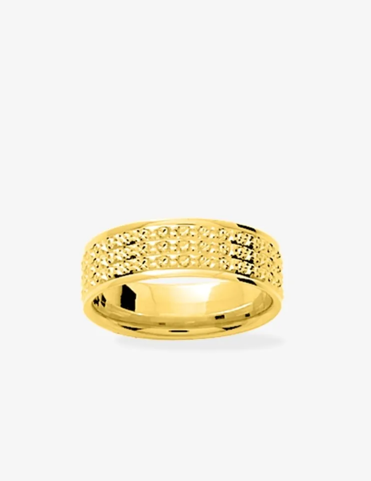 Alliance fantaisie en or jaune 750 ‰ (18 carats), parfait équilibre entre simplicité et raffinement. Son design épuré met en valeur la noblesse du métal précieux, tandis que son poids matière de 5,95 g lui confère une présence affirmée au doigt sans jamais tomber dans l’excès. Cette création intemporelle se distingue par sa polyvalence remarquable, s’harmonisant naturellement avec tous vos autres bijoux et styles vestimentaires. Cette alliance fantaisie incarne l’élégance qui traverse les modes, faisant d’elle un investissement précieux pour sublimer votre allure jour après jour.