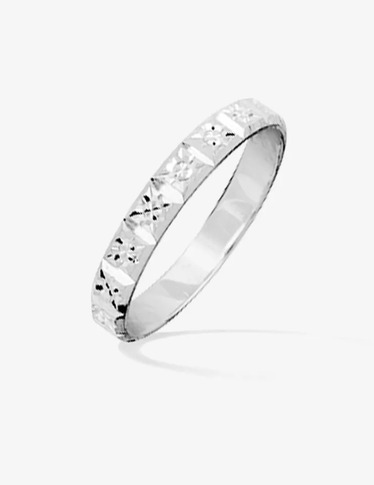 Alliance en or blanc 375 ‰ (9 carats). Cette alliance fantaisie est rhodiée. Elle a une largeur de 3 mm. Son poids d’or moyen est de 1,70 g en taille 54.Cette alliance fantaisie est simple et élégante.Cette alliance peut être gravée à l’intérieur du corps de bague.