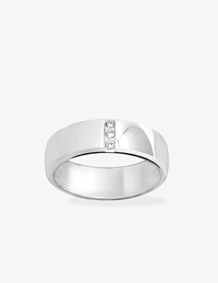 Alliance en or blanc 750 ‰ (18 carats). Cette alliance contemporaine, 3 diamants de 0,042 carats est rhodiée. Son poids d’or moyen est de 7,10 g en taille 54.Cette alliance contemporaine est simple et élégante.Cette alliance peut être gravée à l’intérieur du corps de bague.