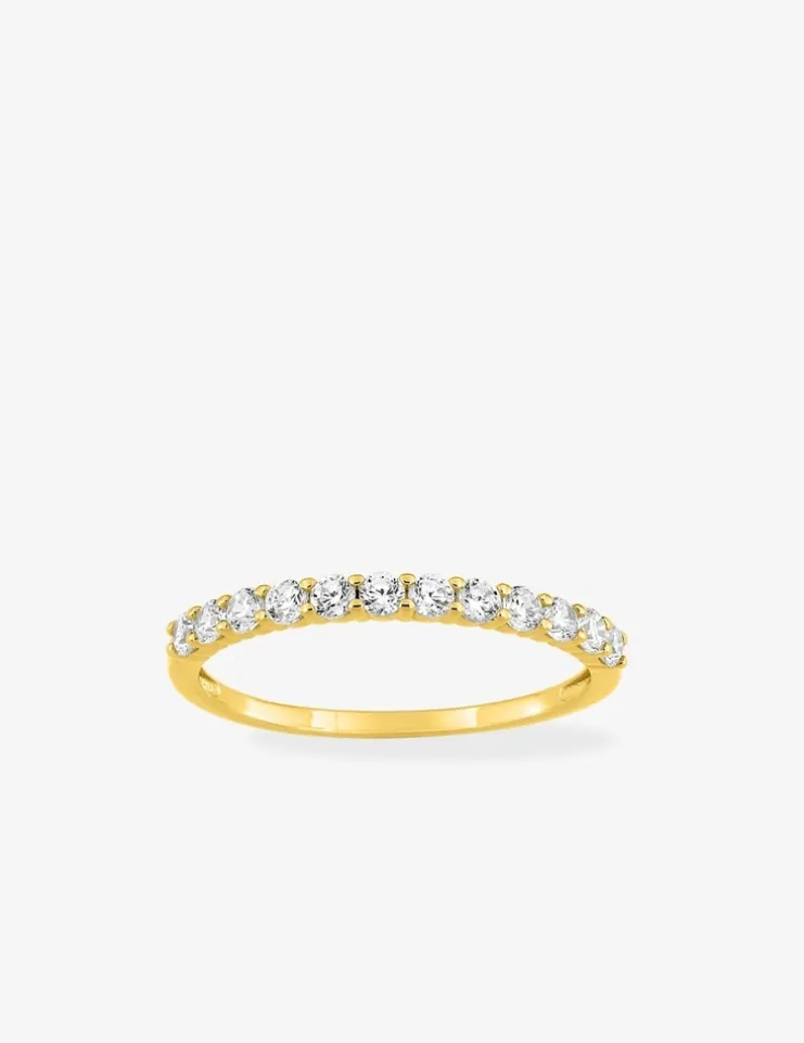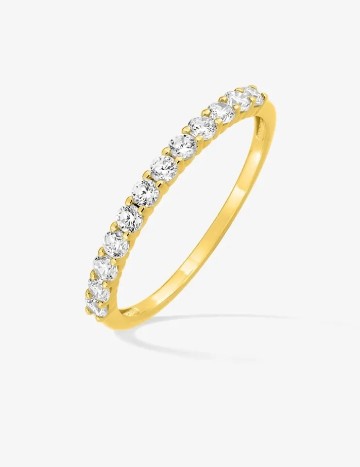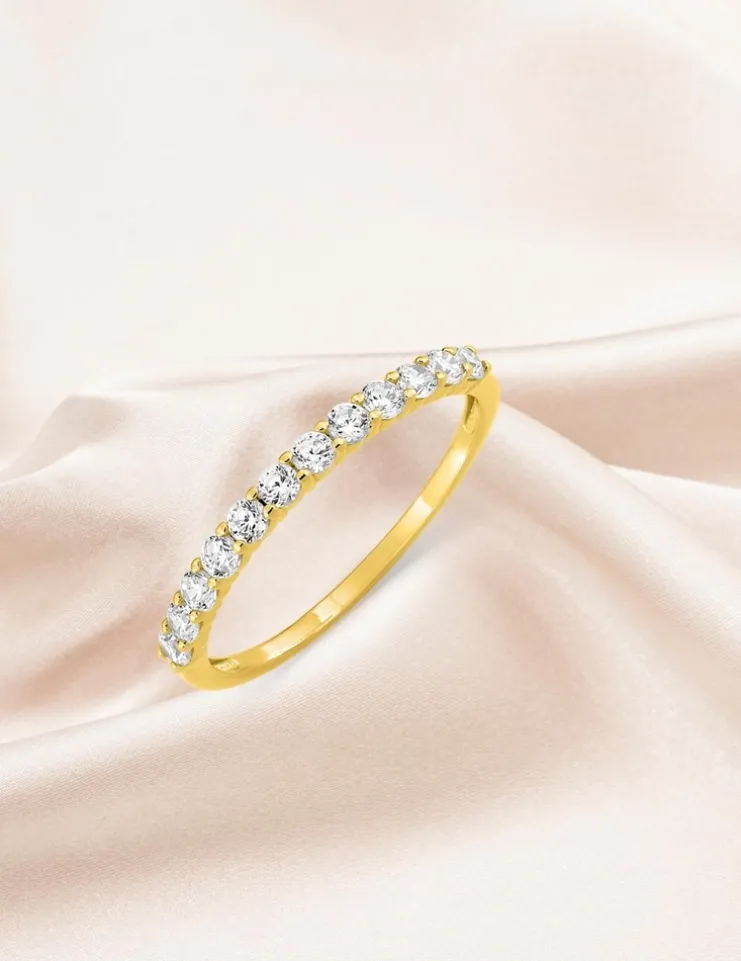 Cette alliance en or jaune 375‰ (9 carats) est sertie de 12 oxydes de zirconium. Cette alliance, au serti griffes, a un poids d’or moyen de 0.75 g. Ce modèle est proposé en or blanc.