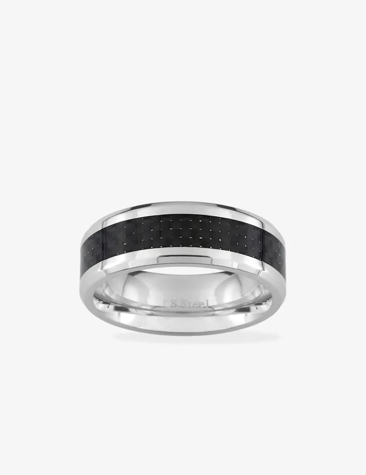 La partie centrale de cette bague en acier possède un effet tissé qui lui confère texture et originalité. Elle mesure 6 mm de largeur.