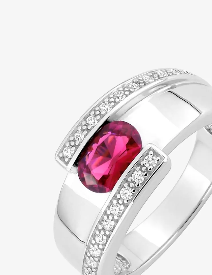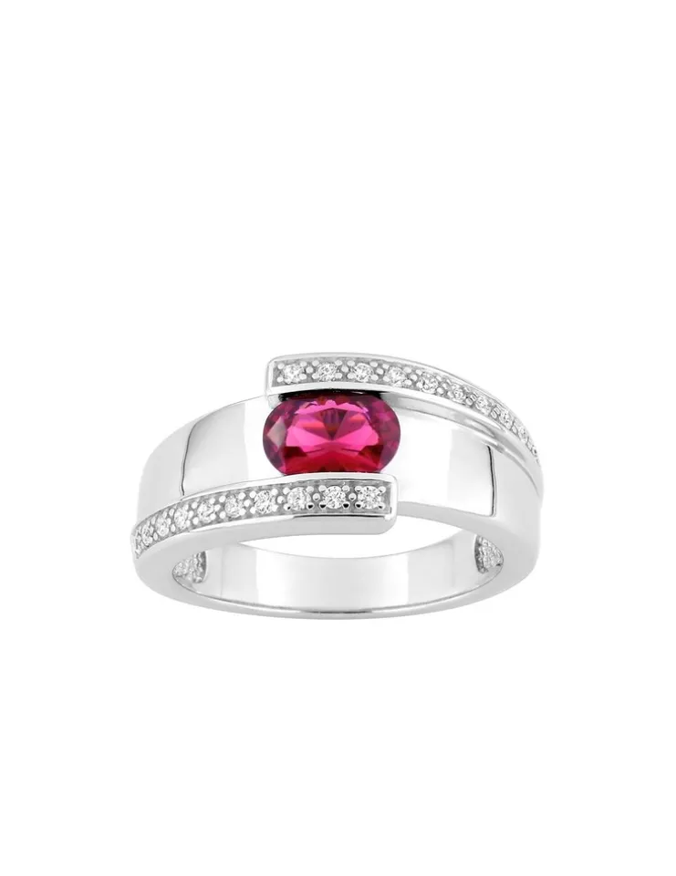 Cette élégante bague se compose d’un anneau en argent 925‰ rhodié rehaussé par un oxyde de zirconium rouge central. De forme ovale, il mesure 7 mm par 5 mm. Il est accompagné de brins sertis d’oxydes de zirconium blancs.