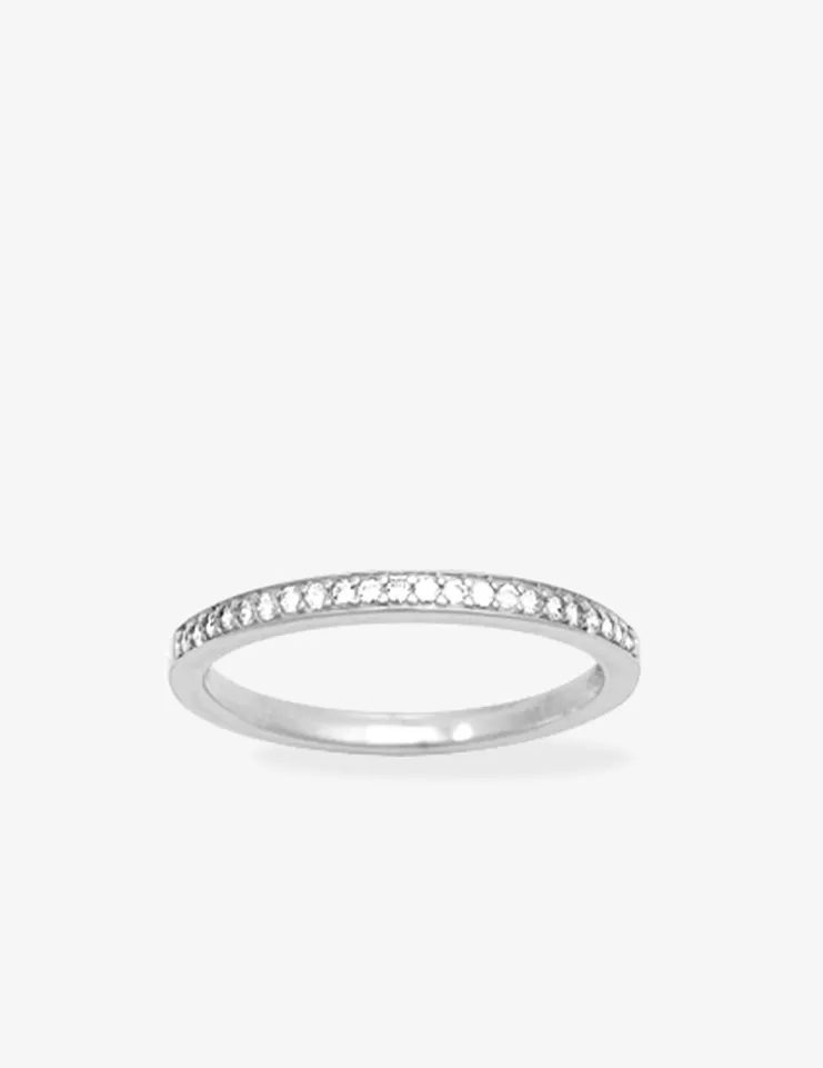 Cette bague en argent 925‰ rhodié possède des oxydes de zirconium blancs sertis griffes. Elle mesure 1,5 mm de largeur. Un modèle simple et intemporel.