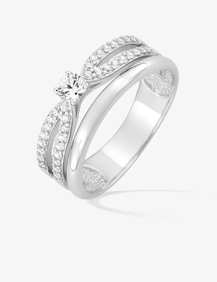 Bague en argent 925 ‰ rhodié composé de 3 anneaux décorés d’oxydes de zirconium. Ce bijou lumineux pèse 3,16 g. pour la taille 54 et sublimera aussi bien vos tenues quotidiennes que celles réservées aux occasions spéciales. Cette bague a une largeur de 5 mm.