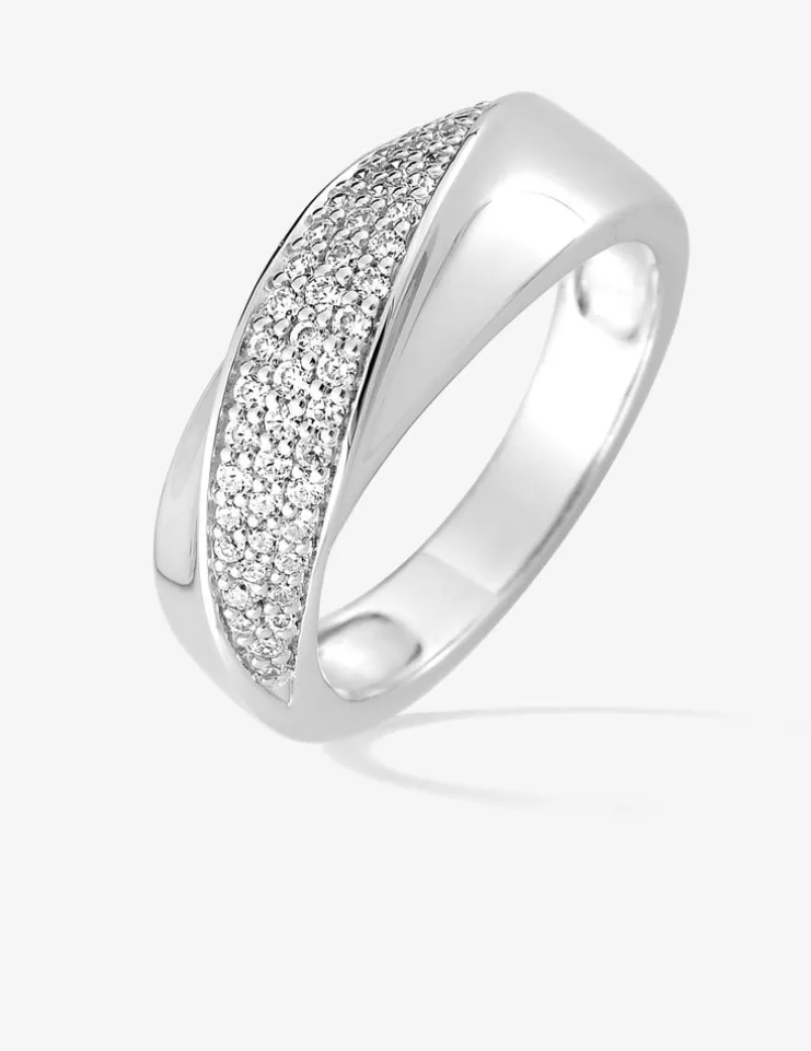 Cette bague faite d’argent rhodié 925 ‰ est traversée par un pavage d’oxydes de zirconium. La bague pèse 4,60 g.