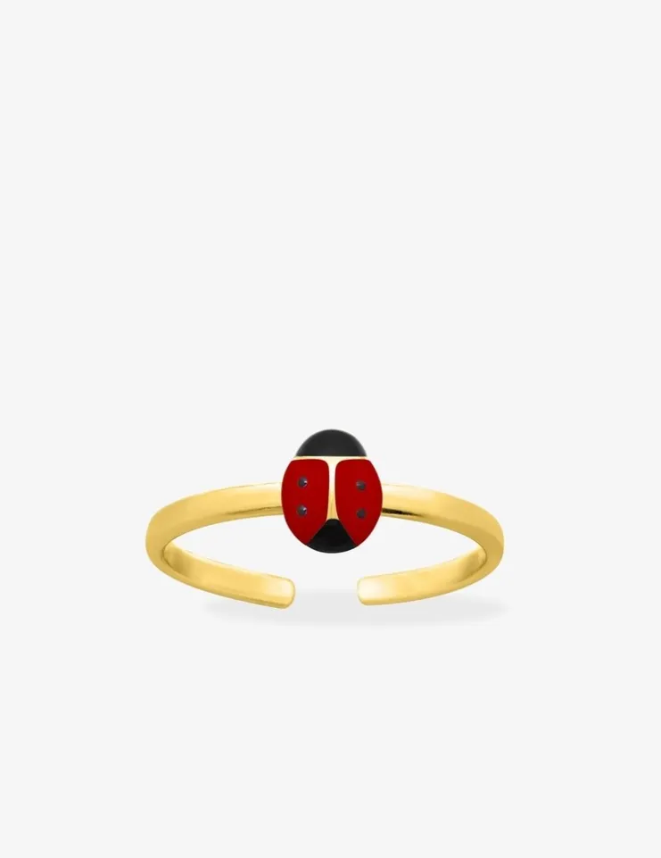 Cette bague réglable au motif de coccinelle faite en plaqué or et teintée par de la laque rouge et de la laque noire ravira les plus jeunes. La coccinelle mesure 6 mm de hauteur.