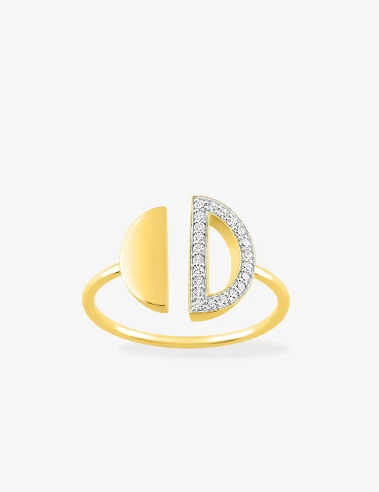 Cette bague au design moderne est composée d’un demi-cercle en plaqué or de 9 mm de diamètre qui fait face à un demi-cercle ajouré en rhodium serti d’oxydes de zirconium de 11 mm de diamètre. Un bijou original à porter au quotidien ou lors d’occasions spéciales.