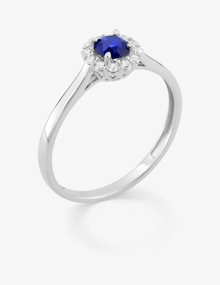 Bague en or blanc 375 ‰ (9 carats) centrée autour d’un splendide saphir synthétique bleu rond de 4 mm de diamètre. La pierre principale est entourée d’une constellation étincelante de diamants synthétiques de 0,13 carat qui amplifie sa beauté en créant un jeu de lumière fascinant. L’éclat immaculé de l’or blanc met parfaitement en valeur la profondeur du bleu saphir et la brillance des diamants. Affichant un poids d’or moyen de 1,15 g, ce bijou allie élégance visuelle et légèreté au porter, garantissant un confort optimal pour une utilisation quotidienne. Son design équilibré et intemporel transcende les modes passagères, s’harmonisant avec aisance à vos tenues les plus décontractées comme à vos parures de soirée les plus élégantes.