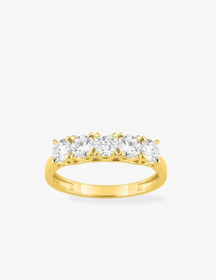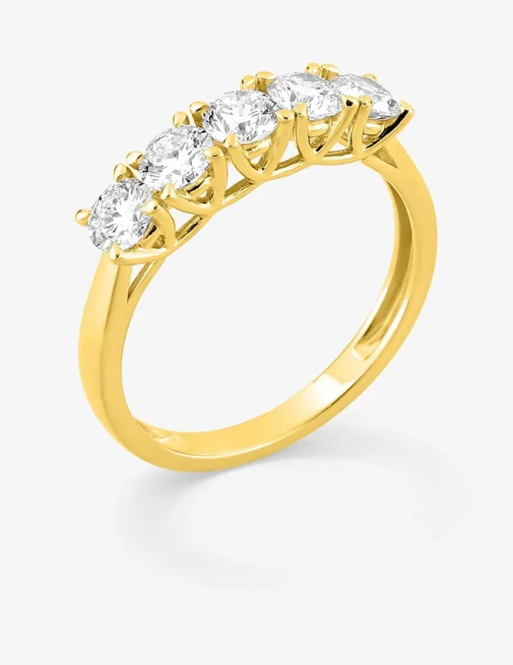 Bague en or jaune 375 ‰ (9 carats), ornée de cinq diamants synthétiques totalisant 1,00 carat, chacun minutieusement serti sur quatre griffes pour une sécurité optimale. Avec un poids d’or moyen de 1,85 g, ce bijou allie légèreté et confort. Optez pour cette bague très lumineuse et éclatante, qui se distingue par son élégance et son charme, captivant tous les regards.