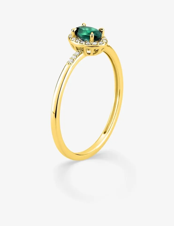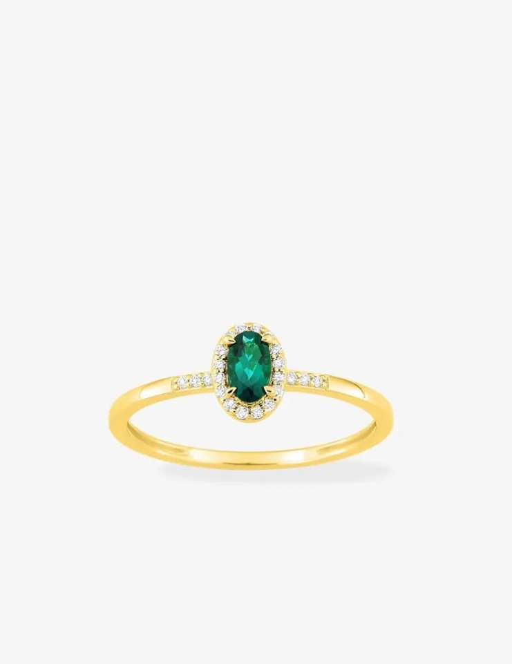 Cette bague en or jaune 375 ‰ (9 carats) met à l’honneur une magnifique émeraude synthétique verte de taille ovale de 5×3 mm. Ce joyau central aux reflets émeraude profonds est délicatement enlacé par une couronne scintillante de diamants synthétiques de 0,07 carat, dont la brillance exceptionnelle crée un contraste saisissant avec les nuances verdoyantes de la pierre principale. La chaleur enveloppante de l’or jaune souligne parfaitement cette alliance de couleurs, apportant une dimension luxueuse à l’ensemble. D’une légèreté remarquable avec un poids d’or moyen de 1,05 g, cette bague se fait oublier au doigt tout en conservant une présence visuelle captivante. Son design parfaitement équilibré marie avec brio élégance et confort, vous permettant de porter ce bijou en toutes circonstances.