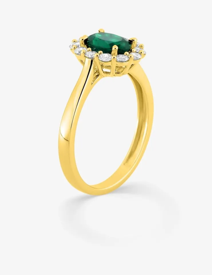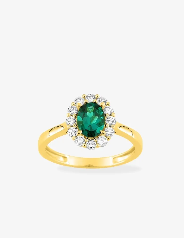Cette bague en or jaune 375 ‰ (9 carats) s’articule autour d’une majestueuse émeraude synthétique verte de taille ovale de 7×5 mm. Ce joyau central aux reflets d’un vert profond et envoûtant est sublimé par une couronne éblouissante de diamants synthétiques de 0,40 carat, dont la brillance exceptionnelle semble amplifier chaque nuance de la pierre principale. Remarquablement légère avec son poids d’or moyen de 1,95 g seulement, cette bague offre une sensation de confort incomparable qui vous permettra de la porter du matin au soir sans même ressentir sa présence. Son design harmonieusement équilibré allie avec élégance une présence visuelle captivante et une légèreté inattendue, faisant de ce bijou un compagnon idéal pour toutes les occasions.