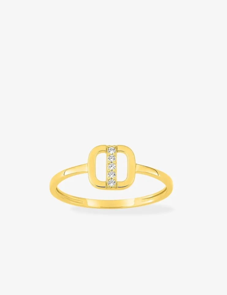Bague en or jaune 375 ‰ (9 carats), dotée d’un motif central en forme de carré aux bords arrondis, orné d’une branche décorée de cinq oxydes de zirconium étincelants. Cette bague aux finitions délicates affiche un poids d’or moyen de 1,00 g. Légère et discrète, elle offre un confort optimal et ajoute une touche d’éclat raffinée à chacune de vos tenues.
