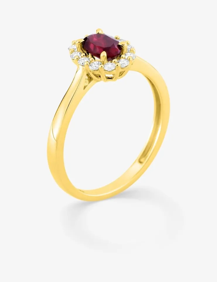 Bague en or jaune 375 ‰ (9 carats) dévoilant un majestueux rubis synthétique rouge de taille ovale de 6×4 mm qui rayonne en son centre. Cette gemme aux reflets carmin profonds est délicatement couronnée par un écrin de diamants synthétiques de 0,23 carat, dont la brillance immaculée magnifie l’intensité de la pierre principale. La rencontre harmonieuse entre la chaleur de l’or jaune, l’ardeur passionnée du rubis et la clarté étincelante des diamants compose un tableau chromatique d’une élégance raffinée. Malgré sa présence visuelle affirmée, cette création ne pèse que 1,85 g d’or moyen, offrant un équilibre parfait entre légèreté au porter et impact esthétique saisissant.