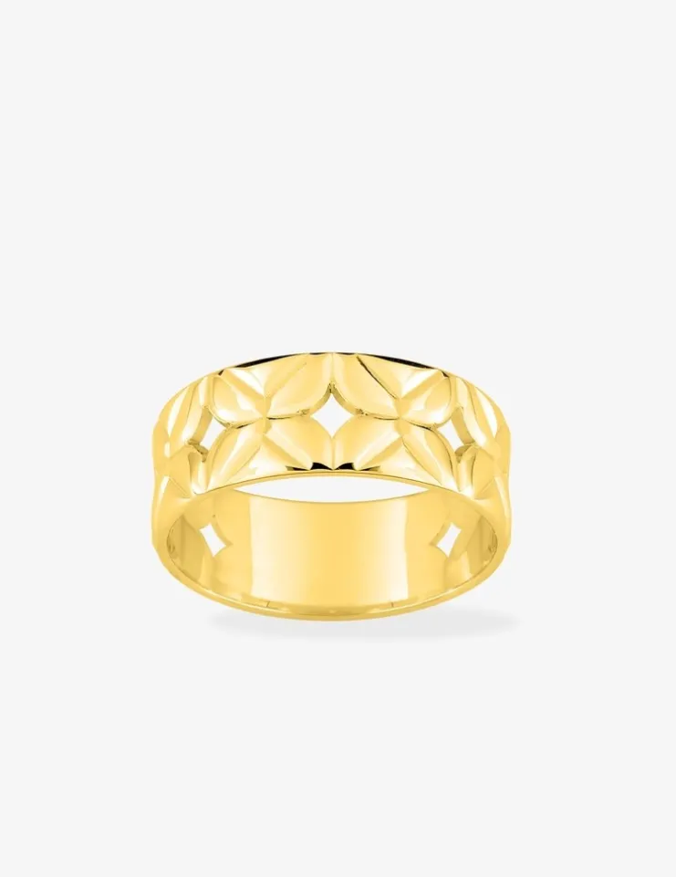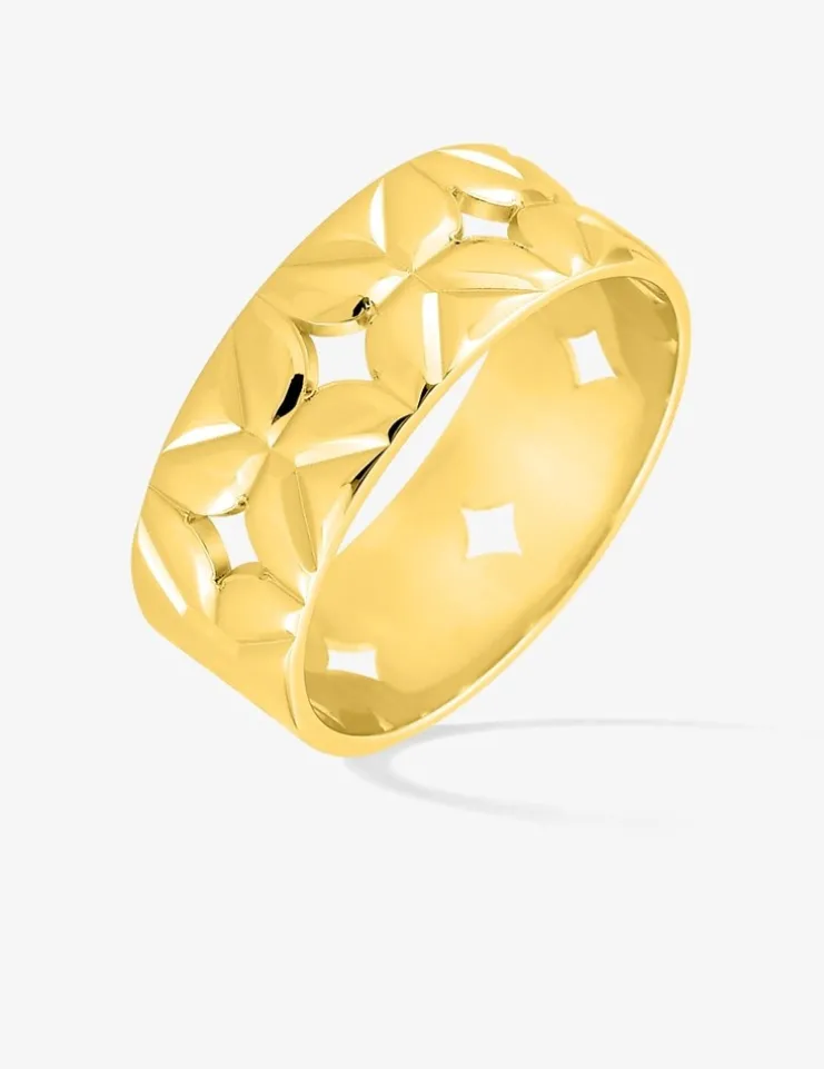 Bague en plaqué or jaune, ornée de découpes à motifs graphiques en relief. Avec une épaisseur de 6 mm et un poids léger de 3,00 g, elle allie élégance et modernité. Un accessoire audacieux qui saura sublimer toutes vos tenues.