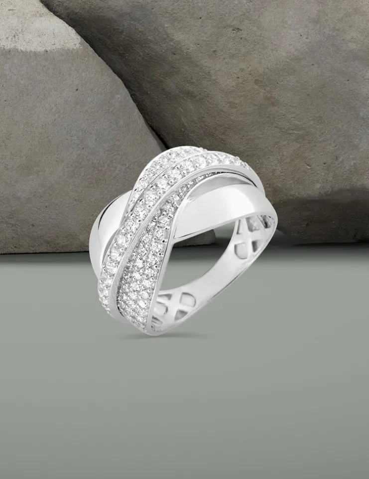 Superbe bague en or blanc 375‰ (9 carats) pavée d’oxydes de zirconium. Trois rubans bordés d’oxydes de zirconium viennent enlacer un anneau tout métal. Ce bijou a un poids moyen d’or de 3,75 g pour une taille 54.Magnifique bague pour un rendu très joaillerie.