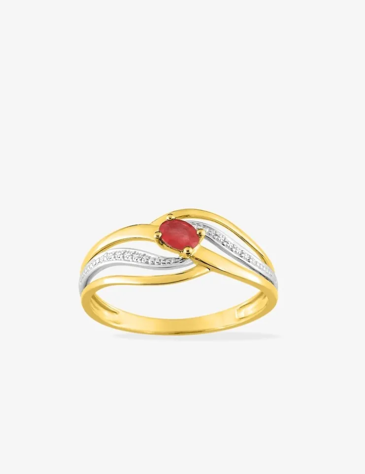 Cette bague en or jaune 375‰ (9 carats) rhodiée est accompagnée d’un rubis de forme ovale. Ce bijou a un poids moyen d’or de 1,25 g. (elle vous est aussi proposée sertie d’un saphir ou d’une émeraude.Jolie bague bicolore dont la pierre précieuse est maintenue par un serti griffe pour un total maintien.