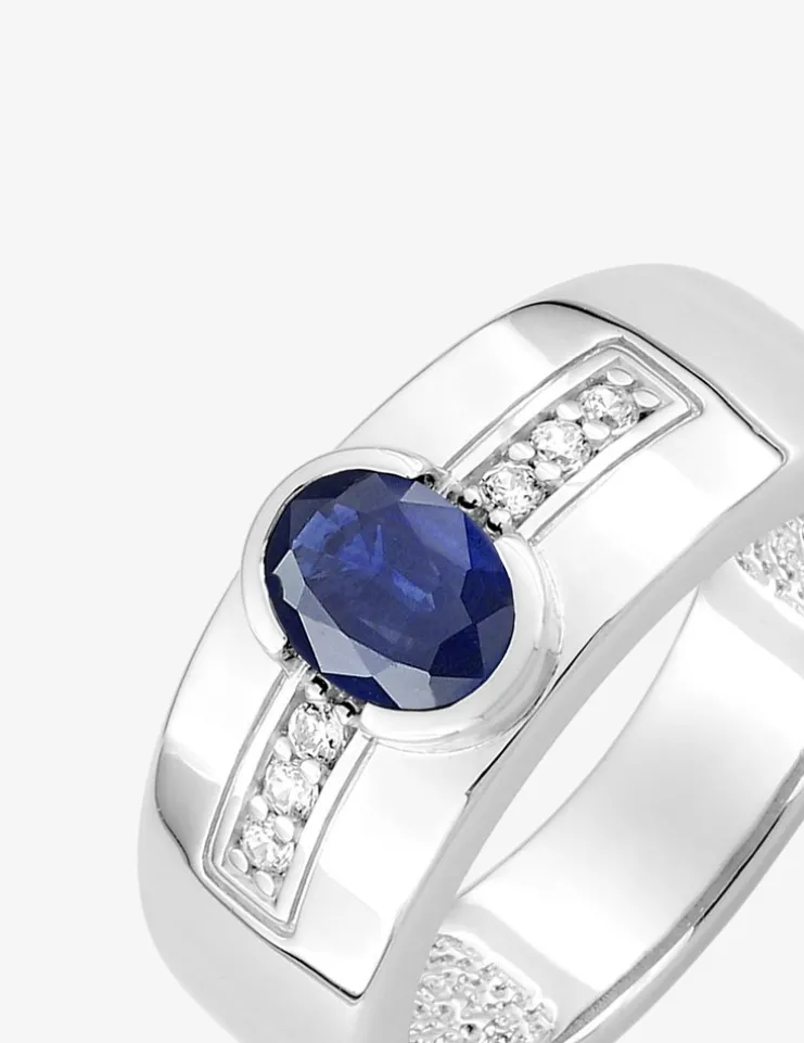 Un oxyde de zirconium bleu ovale est serti au centre d’une ligne d’oxydes de zirconium blancs. La monture de cette bague au design original mesure 8 mm de largeur, et la pierre centrale mesure 6 mm par 5 mm.