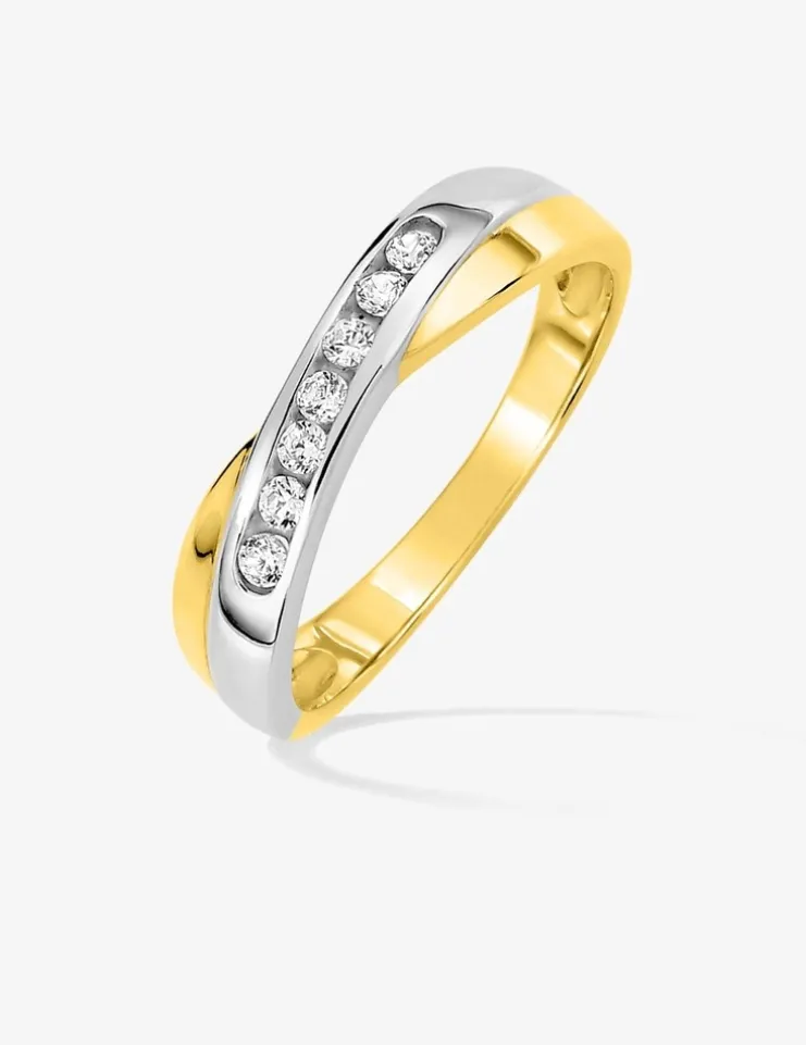 Bague en or jaune 375 ‰ (9 carats) avec rhodium et oxydes de zirconium.Le poids moyen d’or de cette bague est de 2,20 g en taille 54.