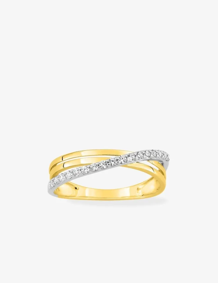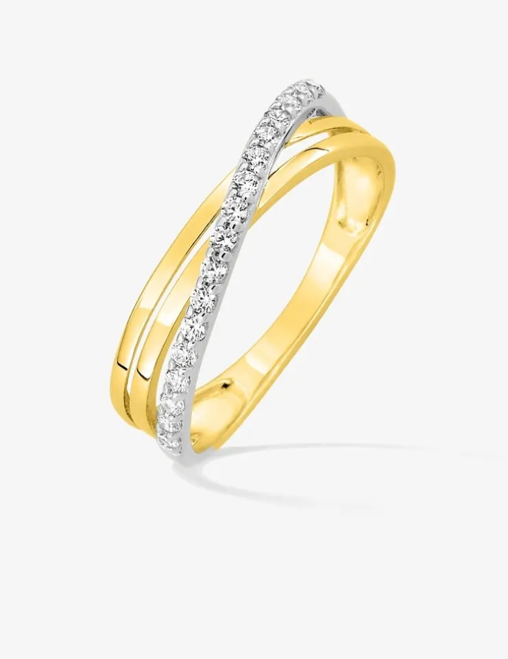 Bague en or jaune 375 ‰ (9 carats) vagues croisées avec rhodium et oxydes de zirconium.Le poids moyen d’or de cette bague est de 1,30 g en taille 54.