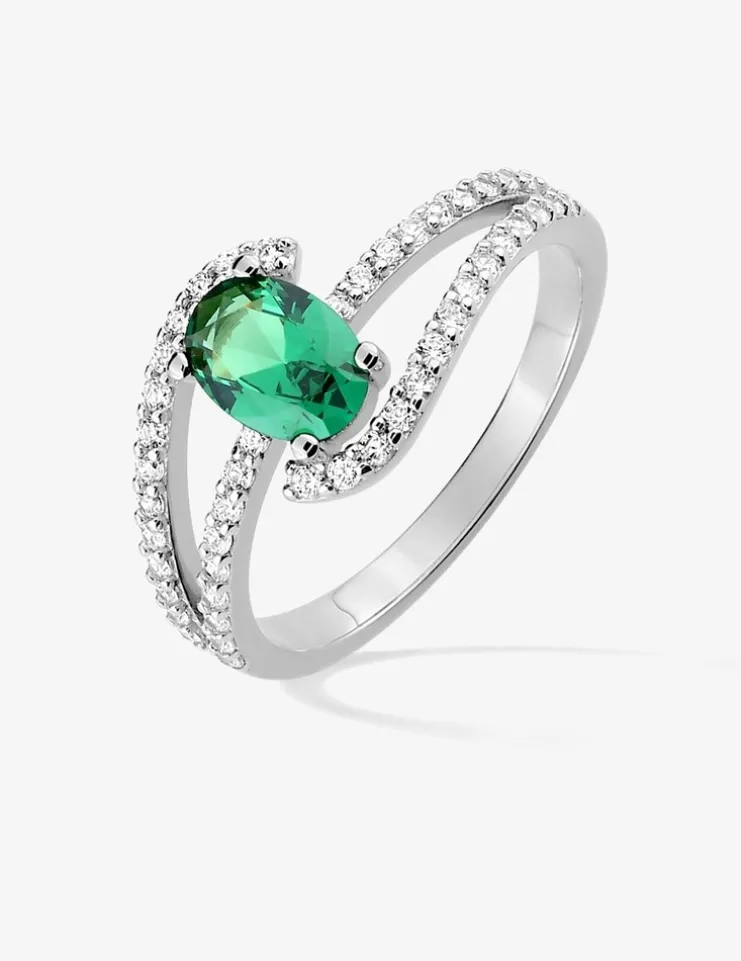 La monture ondulée de cette bague en argent 925‰ rhodié est sertie d’oxydes de zirconium blancs. En son milieu se trouve un oxyde de zirconium vert ovale serti griffes de 6 mm de hauteur.