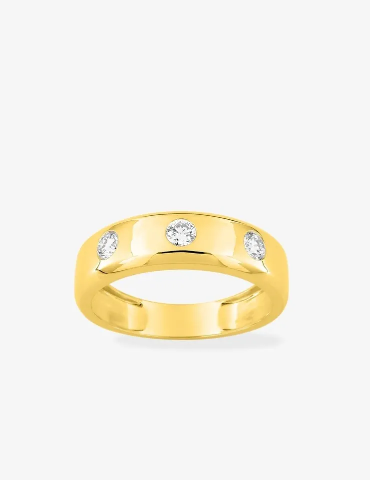 Bague en or 375 ‰ (9 carats) jaune ornée de trois diamants synthétiques 0,45 ct. Cette bague audacieuse affiche un poids d’or moyen de 3,50 g. pour la taille 62 et saura compléter toutes vos tenues.