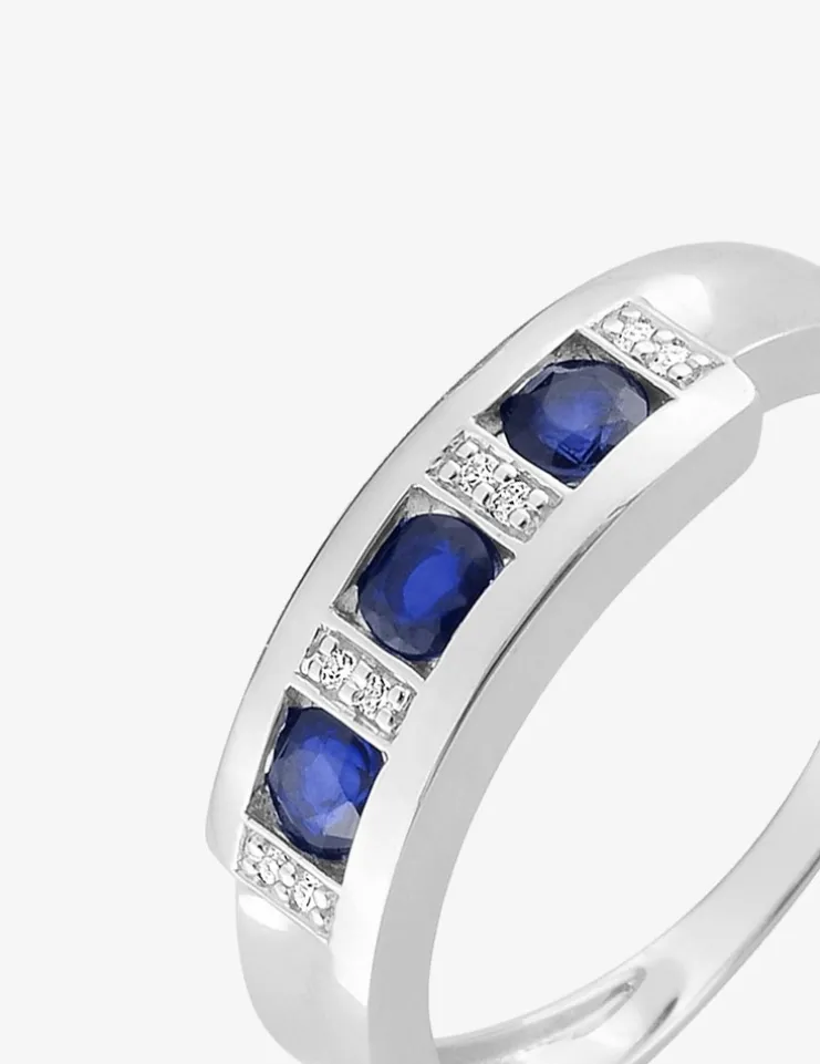 Bague or blanc 375‰ (9 carats) accompagnée de 3 saphirs de forme ronde pour un poids moyen de 0,51 ct, et accompagnés d’oxydes de zirconium. Cette bague a un poids moyen d’or de 1,85 g et vous est aussi proposée sertie d’émeraudes.Un bijou aux lignes résolument modernes et créatives.