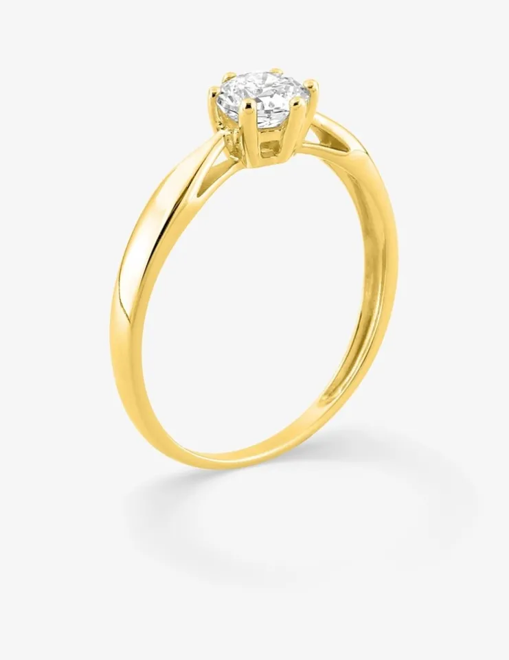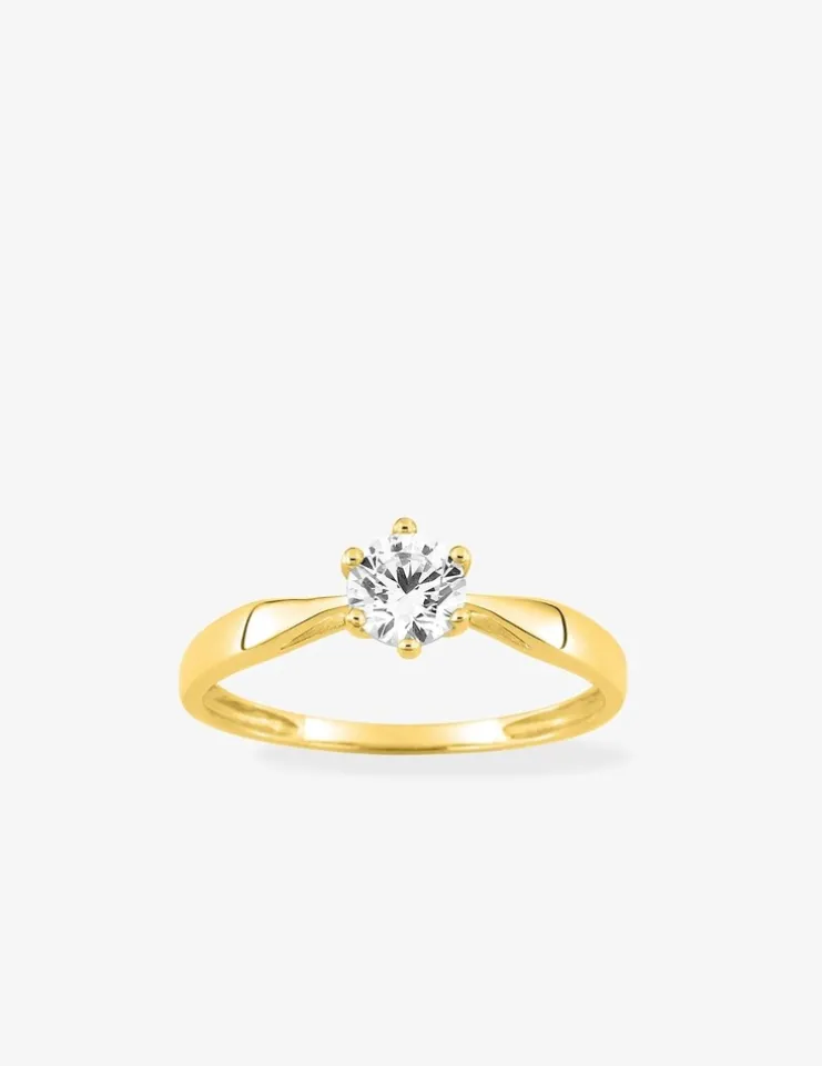 Bague en or jaune 750 ‰ (18 carats) et oxyde de zirconium de 0,50 ct serti griffes, le poids en carat correspond à l’équivalent en diamant. Le poids d’or moyen est de 1,55 g pour une taille 54. Un classique intemporel à porter au quotidien.