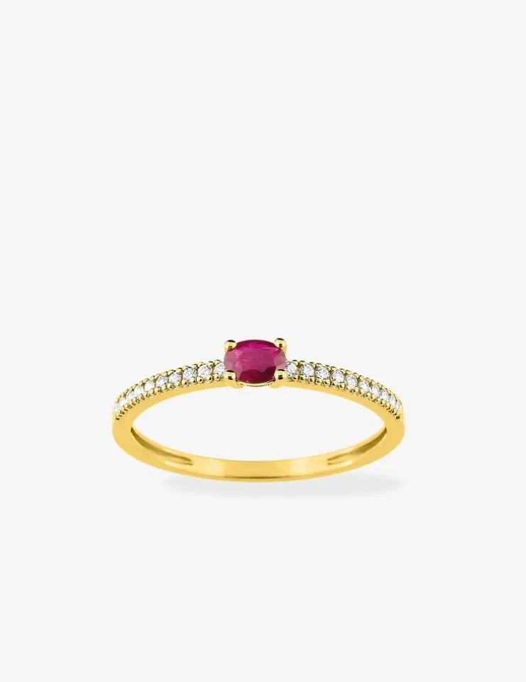 Bague en or jaune 750 ‰ (18 carats) et son rubis ovale serti griffes au centre, entouré de chaque côté par une série d’oxydes de zirconium sertis griffes.