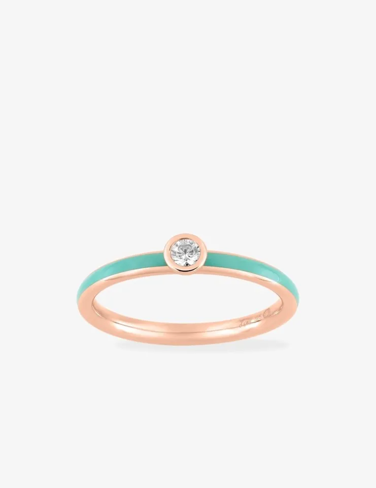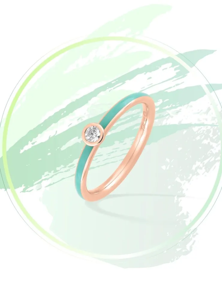 Bague » Lore » en or rose 375‰ et laque de couleur verte aqua de la collection Promesse. Un anneau symbole d’amour éternel rehaussé d’un oxyde de zirconium, cette collection se décline en une éclatante palette de couleurs à marier sans modération.Le poids d’or moyen de cette bague en taille 54 est de 0,65 g.
