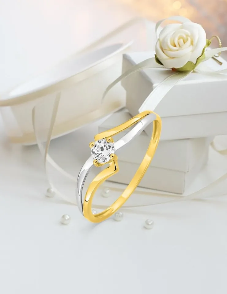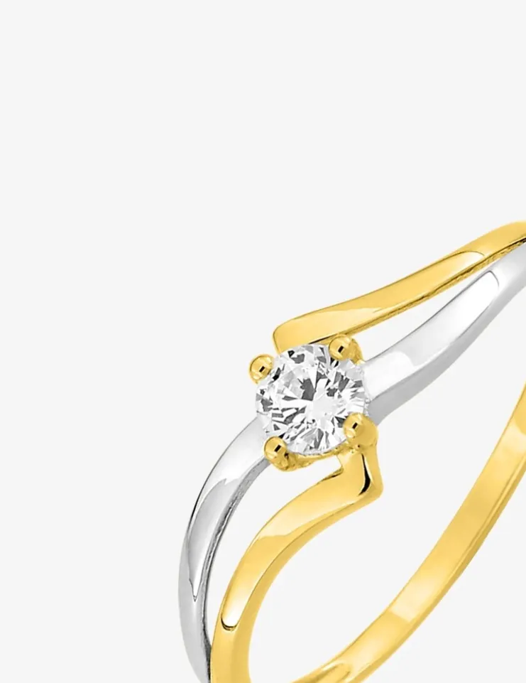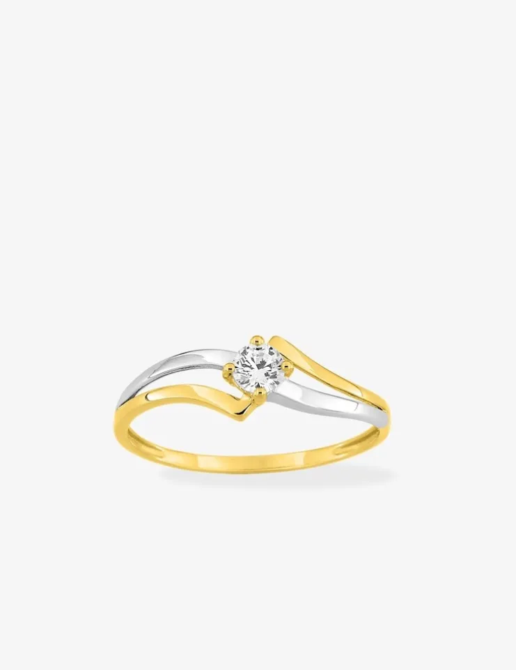 Cette bague solitaire bicolore en or 375 ‰ (9 carats) est accompagnée d’un oxyde de zirconium serti 4 griffes sur une monture ajourée et bicolore avec rhodium.Le poids moyen d’or de ce solitaire est de 0,75 g en taille 54.