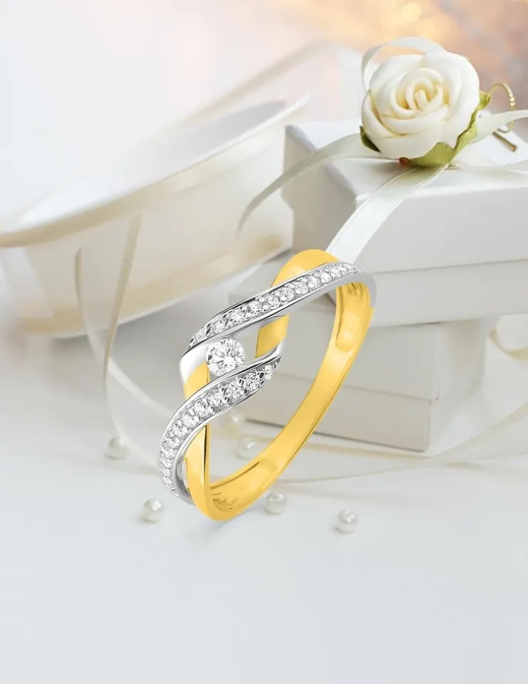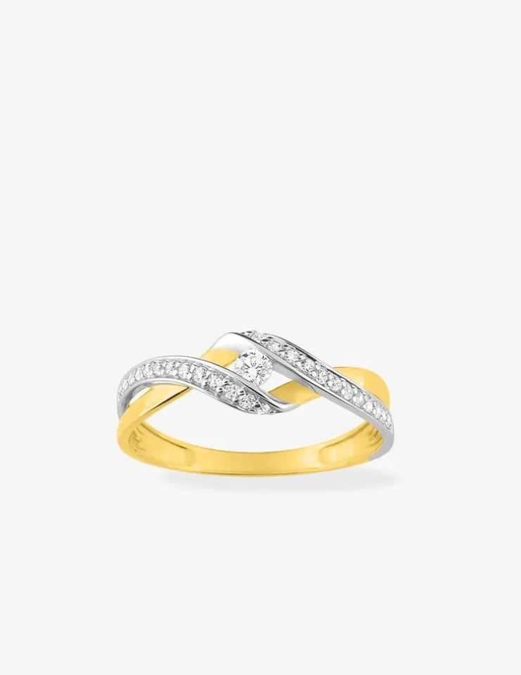 Cette bague solitaire bicolore 375 ‰ (9 carats) est accompagnée d’un oxyde de zirconium serti au centre de la monture entre les parties rhodiées qui possèdent plusieurs oxydes de zirconium.Le poids moyen d’or de ce solitaire est de 1,20 g en taille 54.