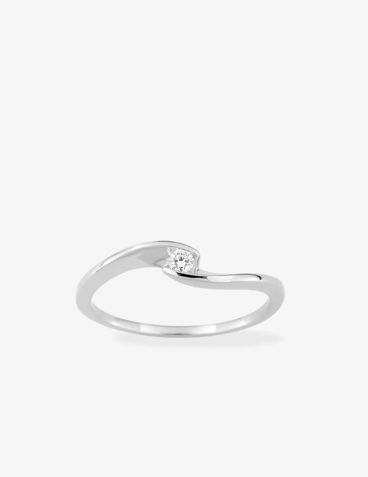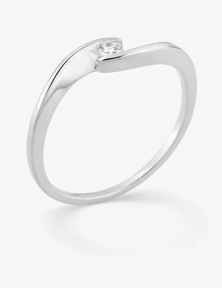 Bague solitaire en or 375 ‰ (9 carats) blanc ornée d’un diamant synthétique de 0,05 ct tenu dans un serti illusion. Cette bague classique et élégante affiche un poids d’or moyen de 1,30 g. pour la taille 54 et rehaussera vos tenues avec une touche de brillance subtile.