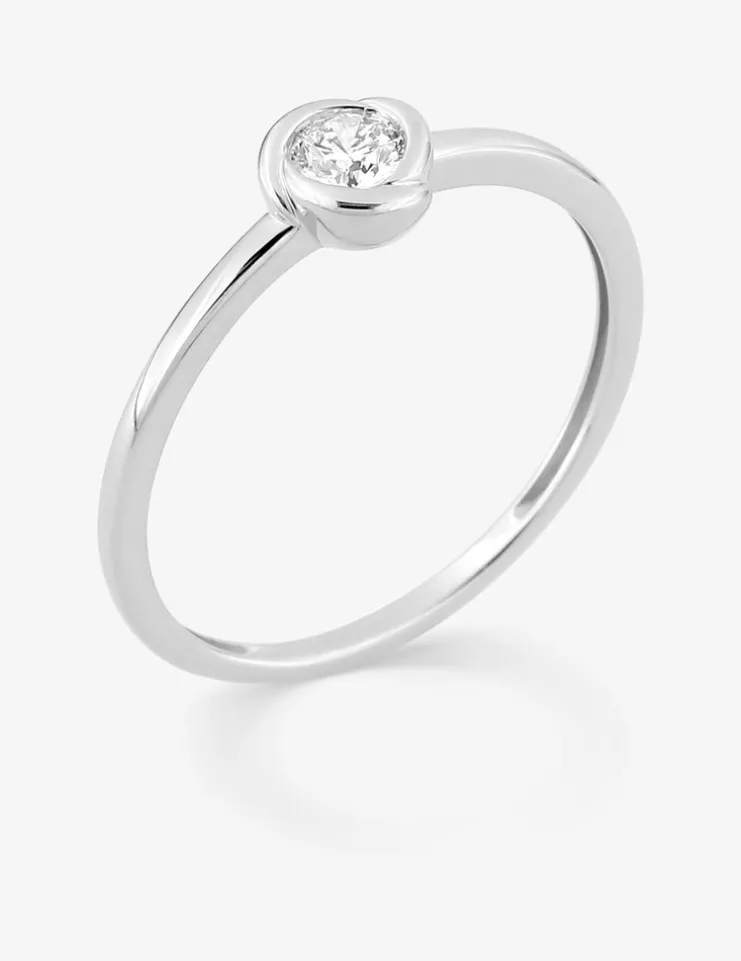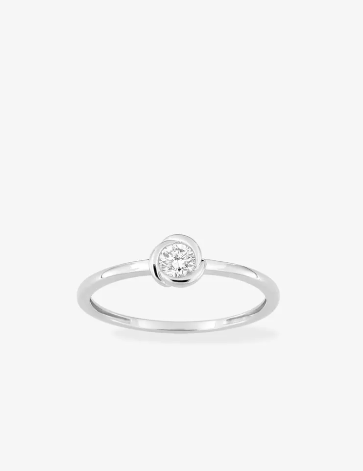 Bague solitaire en or 375 ‰ (9 carats) blanc ornée d’un diamant synthétique de 0,15 ct tenu dans un serti clos. Cette bague classique et élégante affiche un poids d’or moyen de 1,10 g. pour la taille 54 et rehaussera vos tenues avec une touche de brillance subtile.