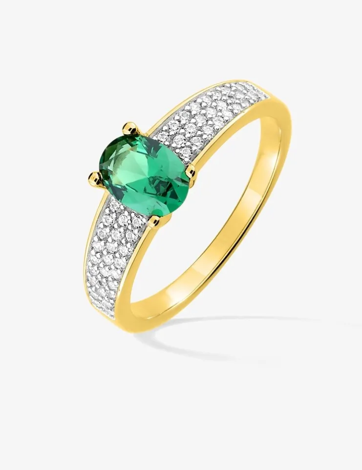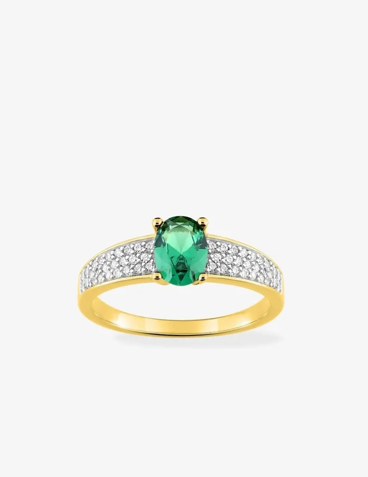 Cette bague solitaire plaquée or arbore un oxyde de zirconium vert de 7 mm, entouré de petits oxydes blancs pour un contraste raffiné. Avec un poids de 1,80 g pour une taille 54, elle allie finesse et éclat, tout en ajoutant une touche de glamour à votre look.