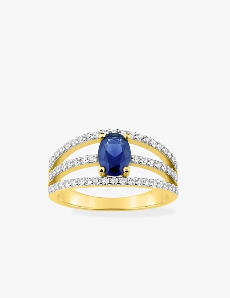 Découvrez cette élégante bague solitaire en plaqué or. Elle est sertie d’oxydes de zirconium blancs sur du rhodium et, au centre, d’un oxyde de zirconium bleu serti griffes.